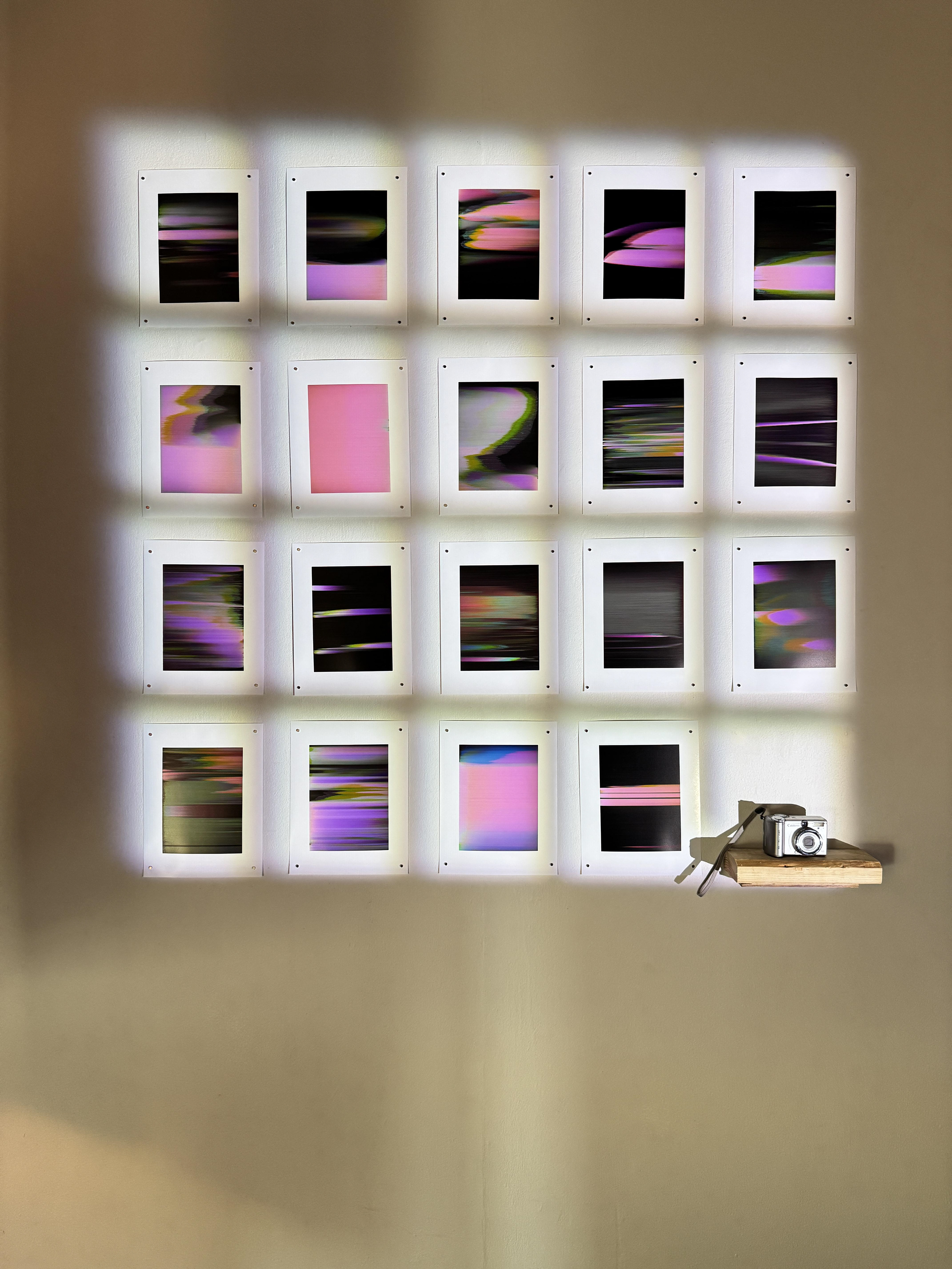 In other pieces, Novelo utilizes disposed digital cameras to capture new images. While most have been tossed aside because of glitches and imperfections in their sensors–what might be labeled as breakage and failure–he sees this as a useful tool to make images differently. The resultant ghostly smears of color make unseen things visible; perceiving things that are outside our current realms of knowing. The display screens in the installation also feature pixelization and cracks, elements that constantly remind us of the process of looking and the workings of the tool, not just an open window to peer through.