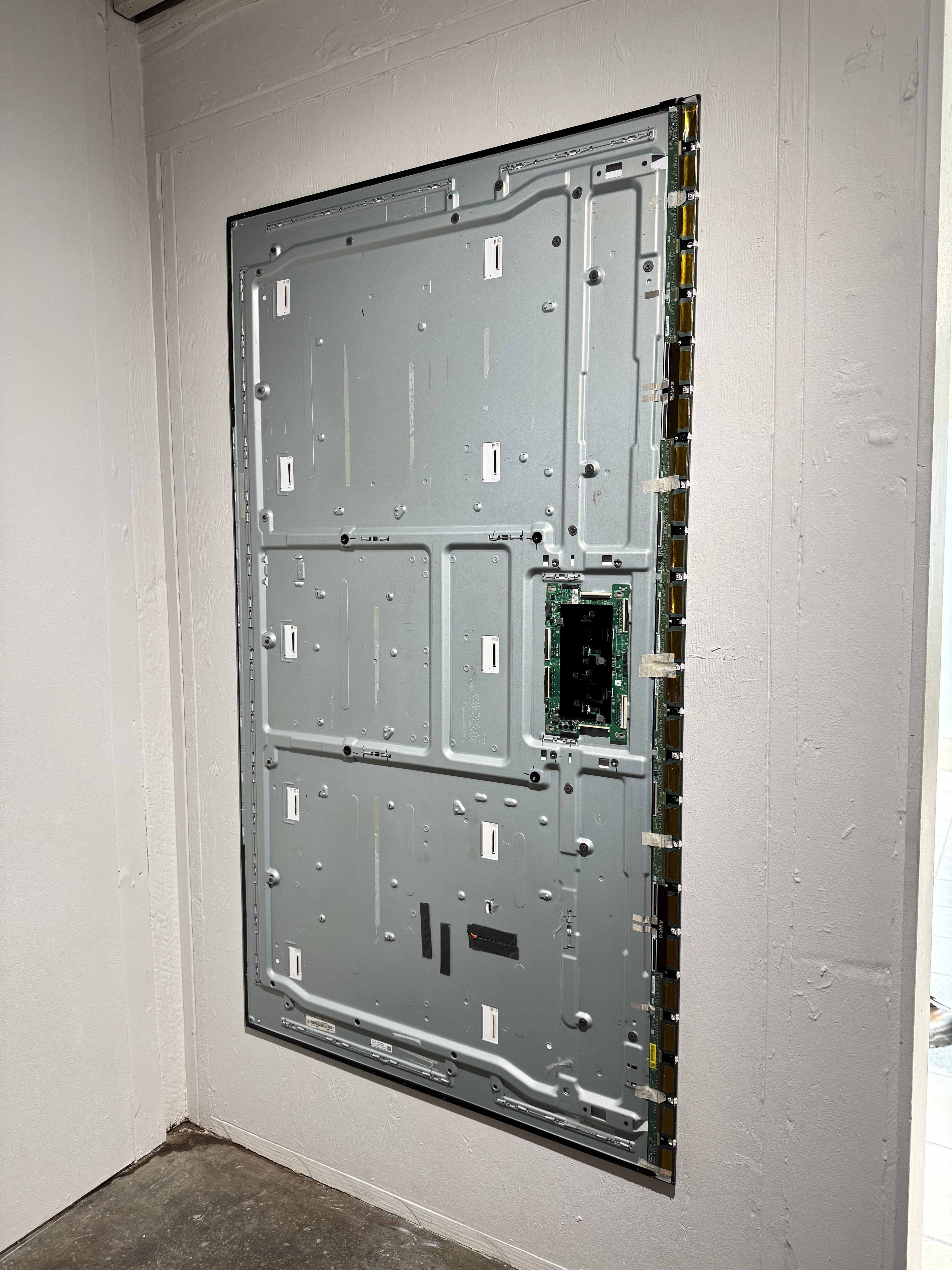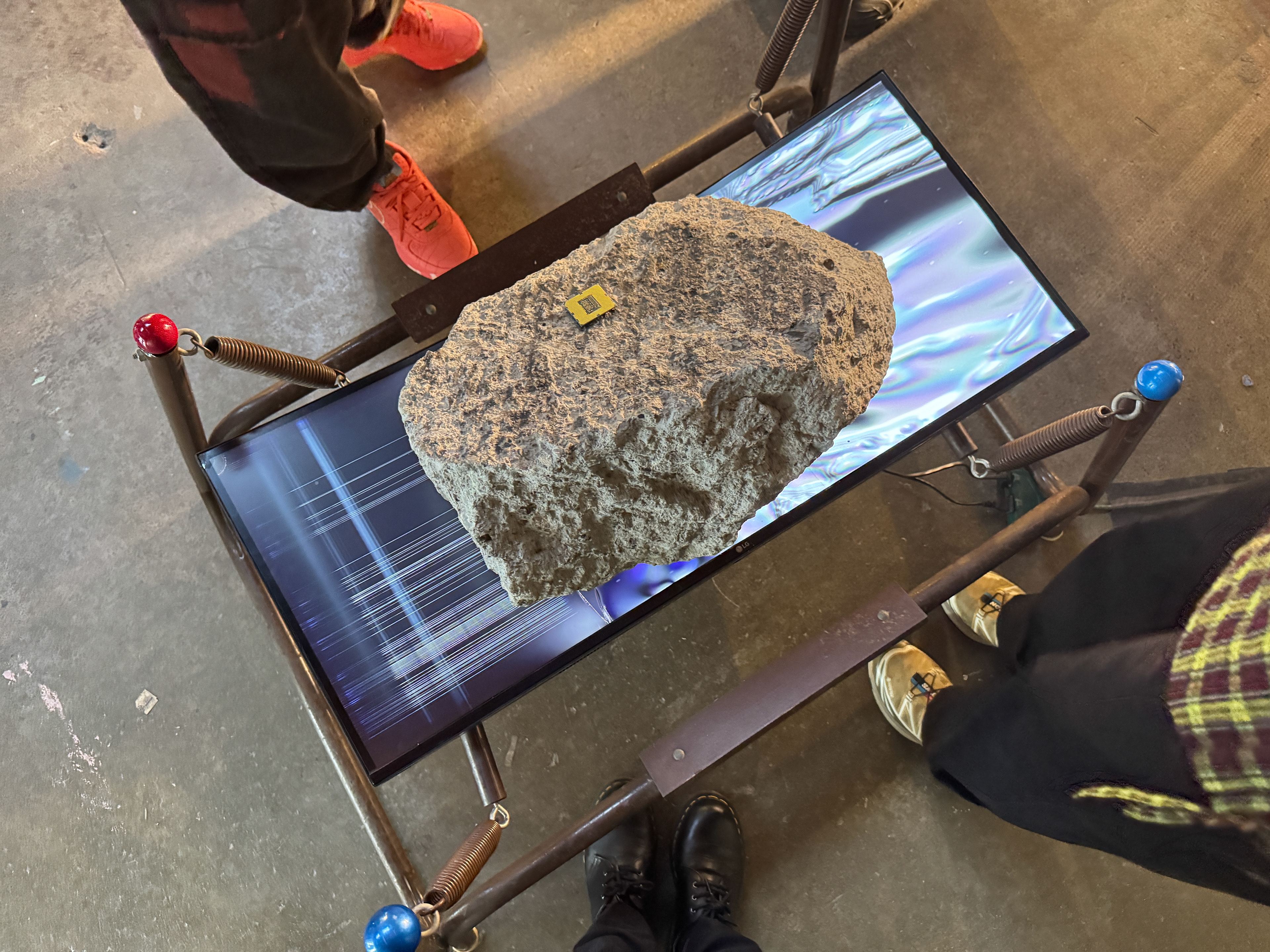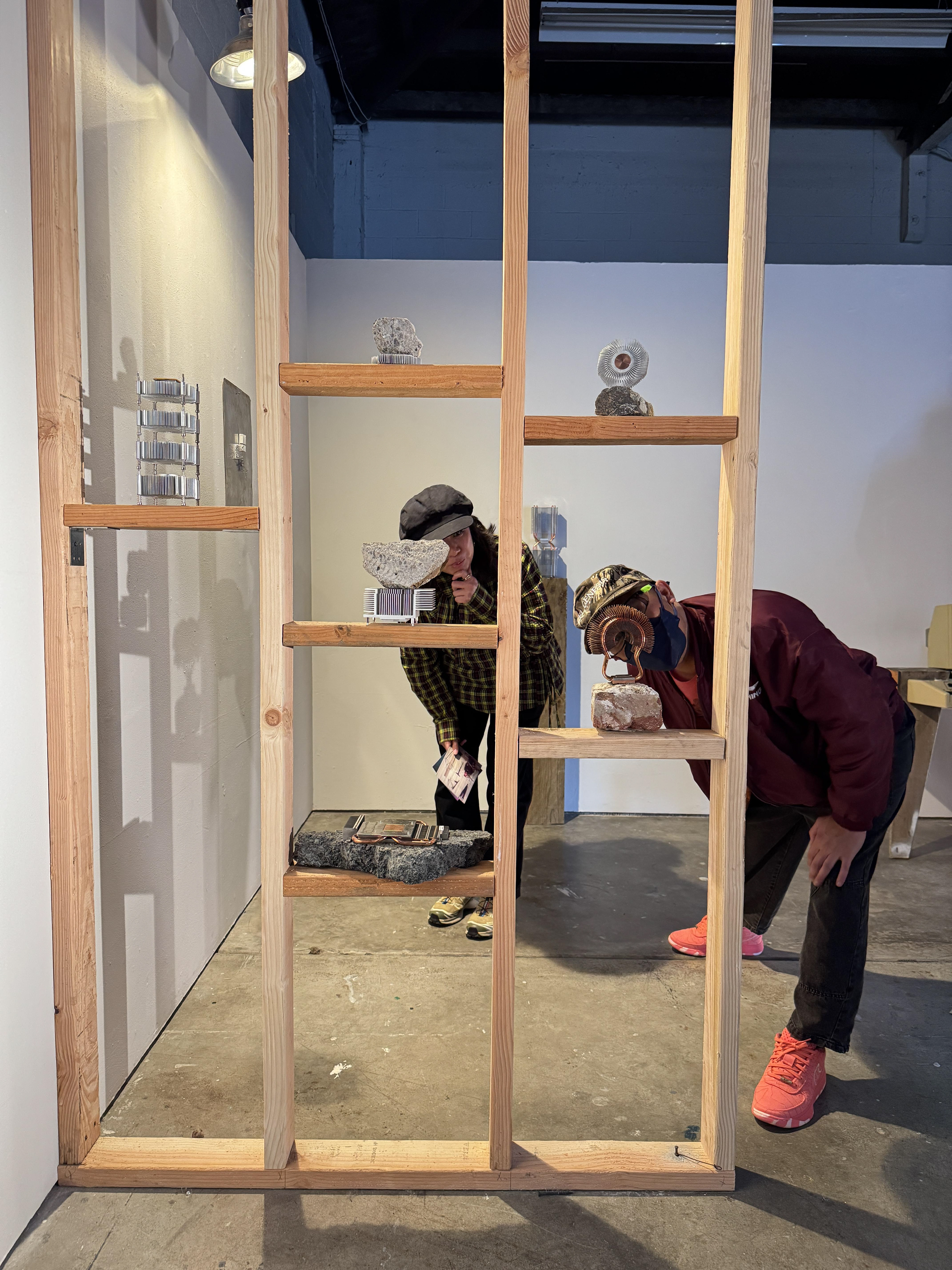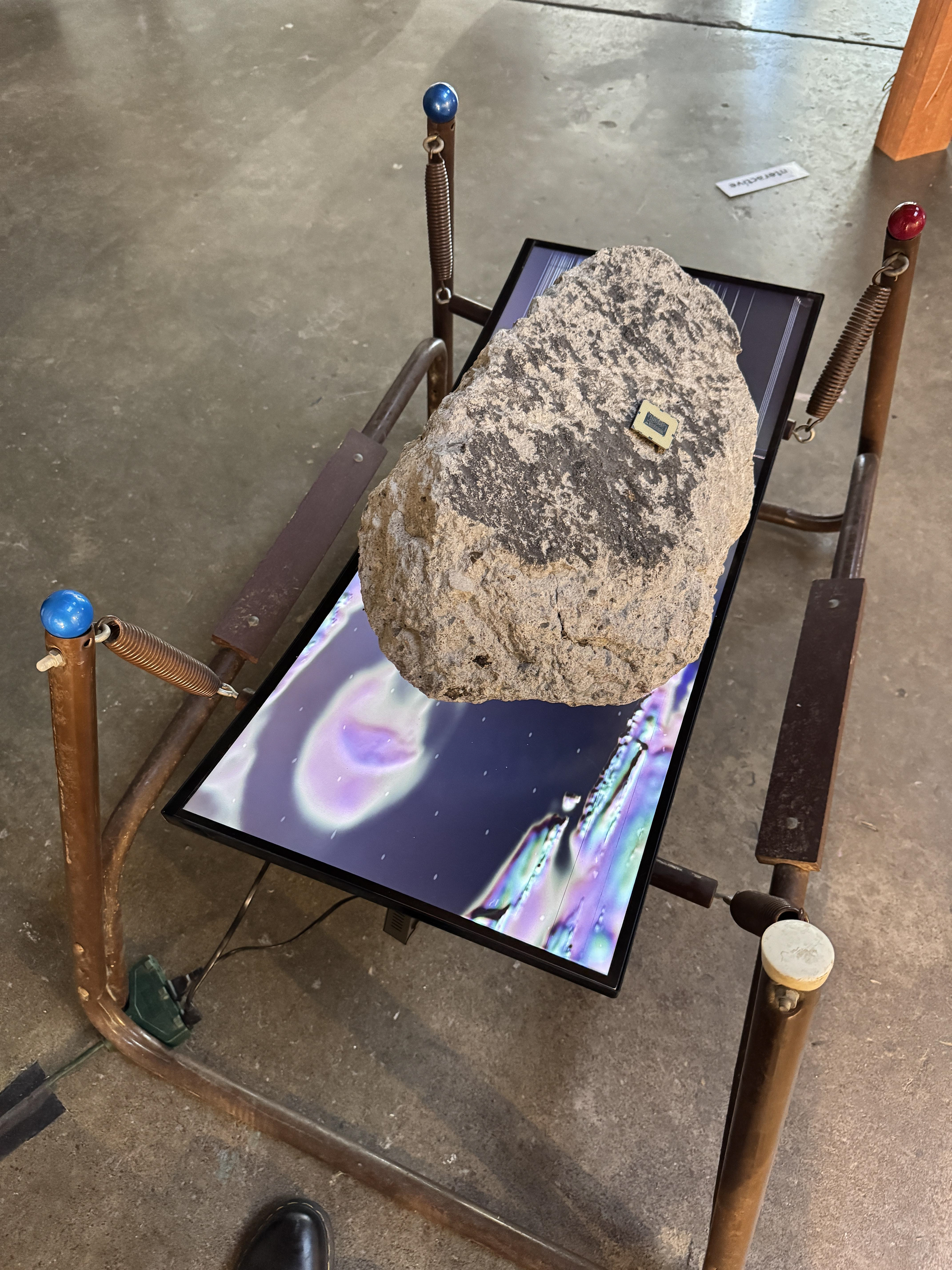 By layering disparate technologies in the installation, like a digital screen and an automobile tire, Novelo animistically opens portals into the inner lives of our tools–giving a sense of their possible past histories and purpose. The screen displays the wheel–an ancient technology–as it rolls away and moves about. In other sculptures, Novelo cracks open computer casings and motor blocks, laying bare the inner mechanisms of tools typically hidden beneath polished surfaces. Computer case panels are utilized to build a larger structure of surfaces on surfaces; only obscuring other covers. Fans and heat sinks are displayed, recognizing their value to the smooth operation of our tools and emphasizing the resource costs of their workings.